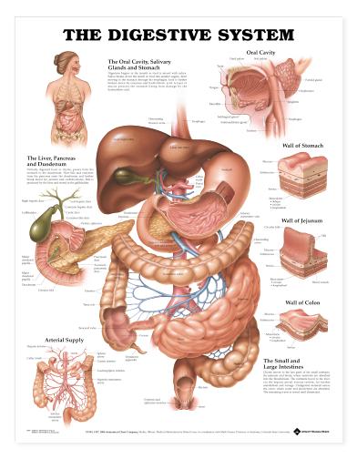 Shows oral cavity, glands, stomach, liver, pancreas and duodenum. Provides cross sections of wall of the stomach, the jejunum and the colon. Also illustrates arterial supply. Size is 20" W by 26" H.