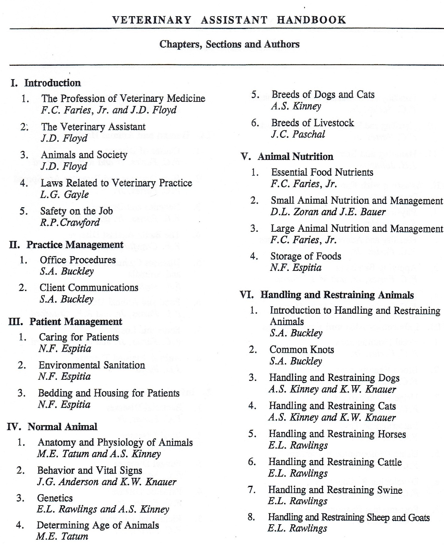 This handbook 1) provides a general introduction to the professional field of veterinary medicine and, 2) presents a concise summary of techniques utilized by veterinary techs and para-professionals.