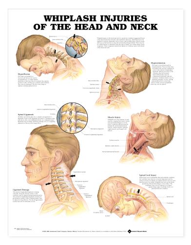 Defines whiplash and shows hyperflexion, hyperextension, spinal ligaments, ligament damage, muscle injury and spinal cord injury. Size is 20" W by 26" H.